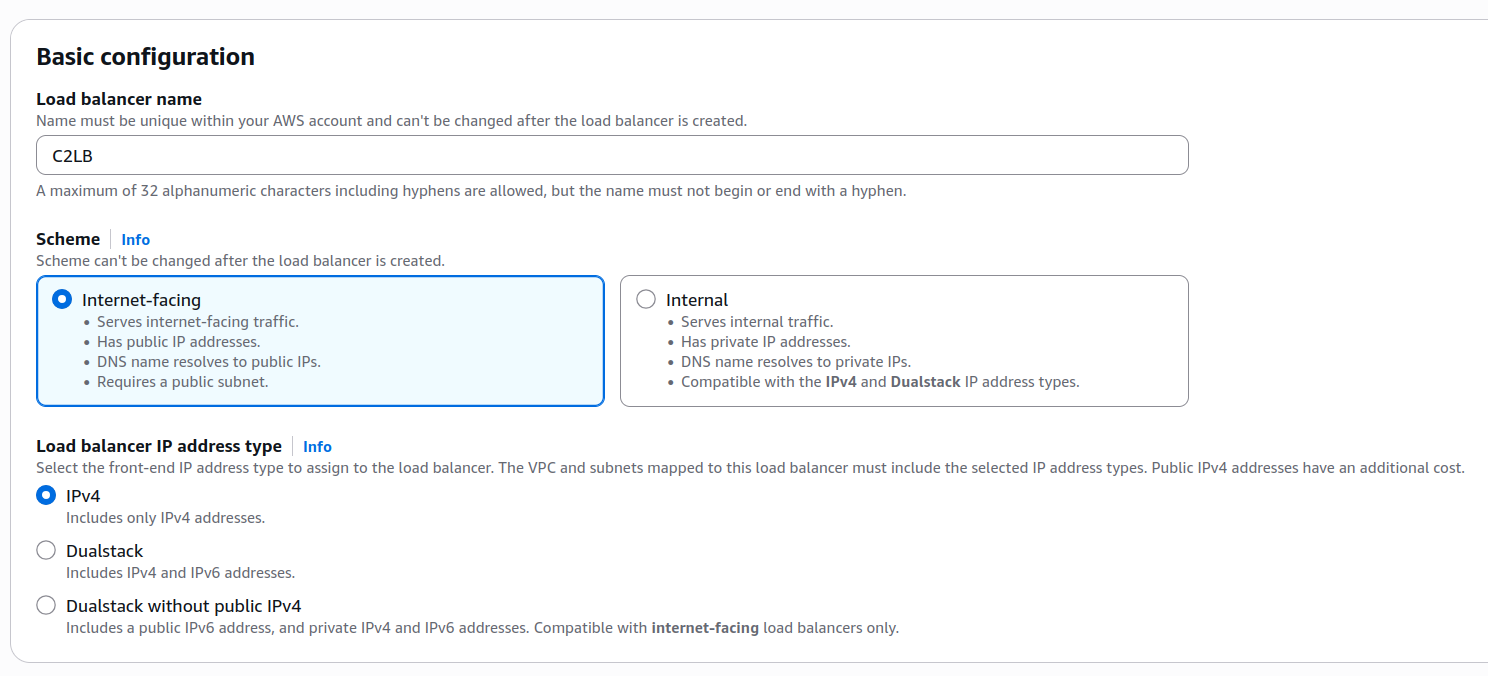 Name the load balancer (in this case “C2LB”), and set the scheme to Internet-facing.