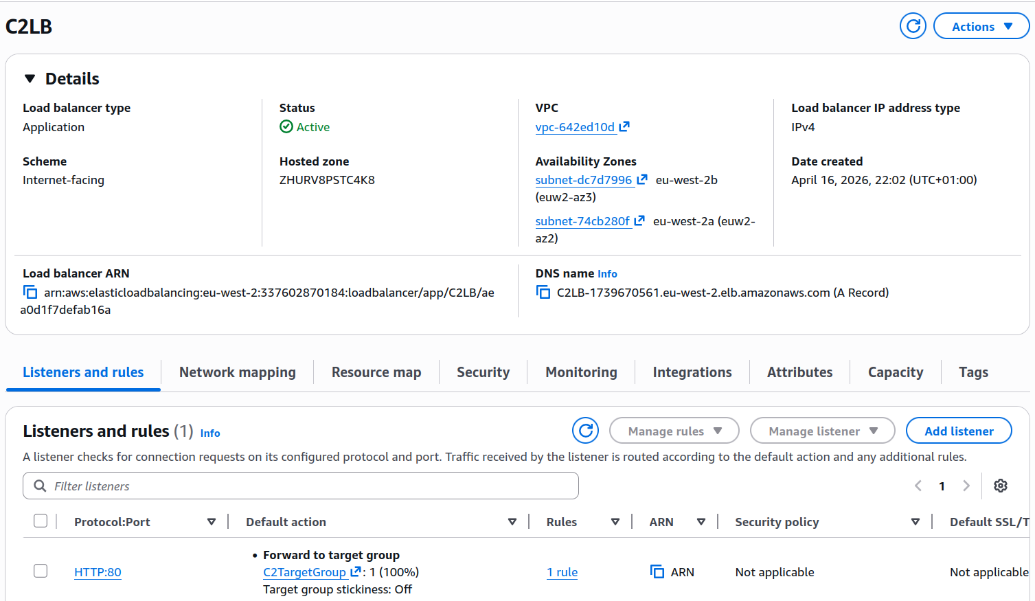 Once the ALB is configured, copy the external ALG DNS name and ensure you can access the C2 server using it.