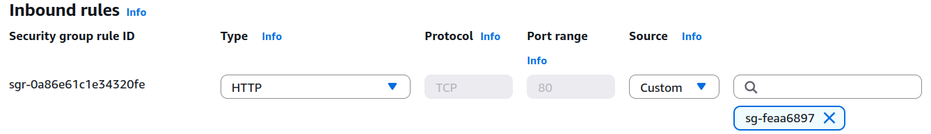 First, we need to prevent direct access to the EC2 instance. Delete the existing inbound HTTP security group rule, and create a new rule that only allows HTTP access from the security group of the Elastic Load Balancer.