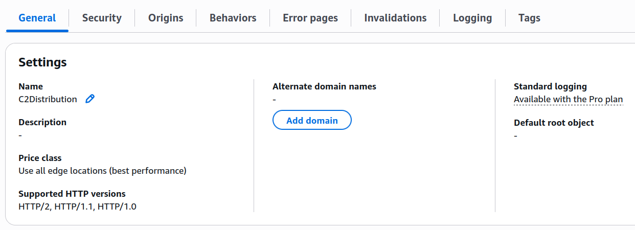 Once the settings are saved, it will likely take 15 minutes for the Cloudfront distribution to be deployed. This should provide you with a URL you can use to contact the C2 server (in our case d1jwmmshxm70pa.cloudfront.net)